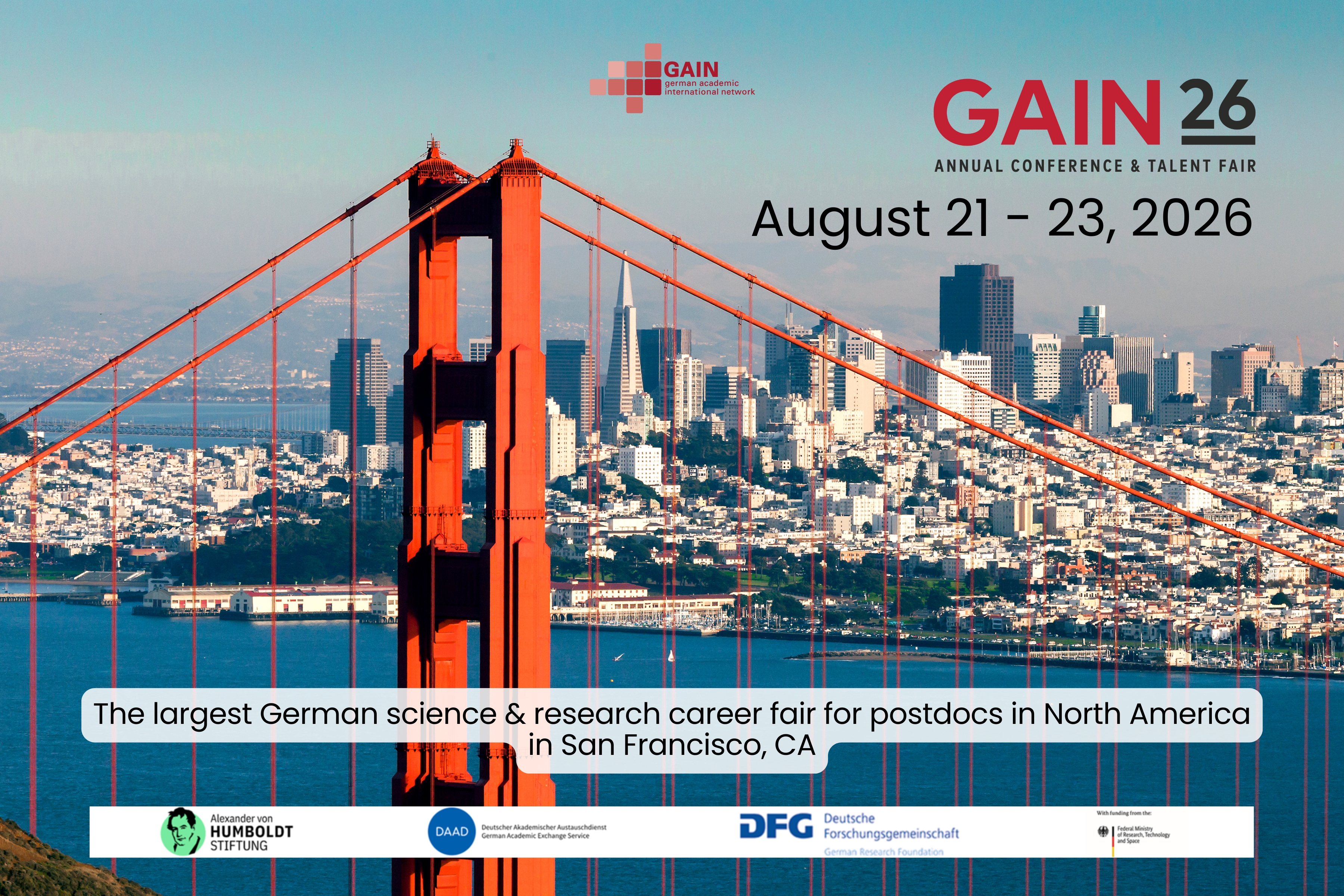GAIN26 is the annual conference and talent fair of the German Academic International Network. It is the largest gathering of German universities, funding agencies and scientists abroad. Please join over 500 postdocs, scientists and experts from various research areas and gain access to information about career paths and funding opportunities in Germany. More than 80 German universities, research institutions, companies, and funding agencies can offer jobs and support as well as provide valuable insights and best practices at our talent fair and workshops.